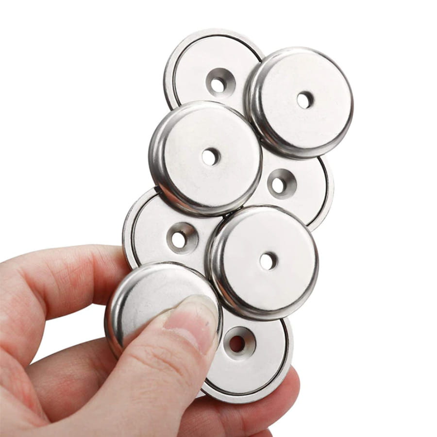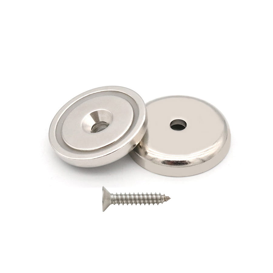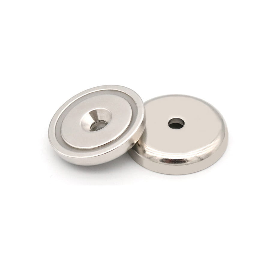 Stalowa konstrukcja przypominająca płaską miseczkę pełni funkcję wzmacniającą, chroniąc magnes przed uszkodzeniami mechanicznymi oraz przedłużając jego żywotność. Ocynkowana blacha stalowa spełnia doskonale tą funkcję, zwłaszcza w trudniejszych warunkach pracy. Rozwiązanie zwiększa także stabilność magnesu podczas jego styku z metalowymi elementami, z którymi współpracuje.