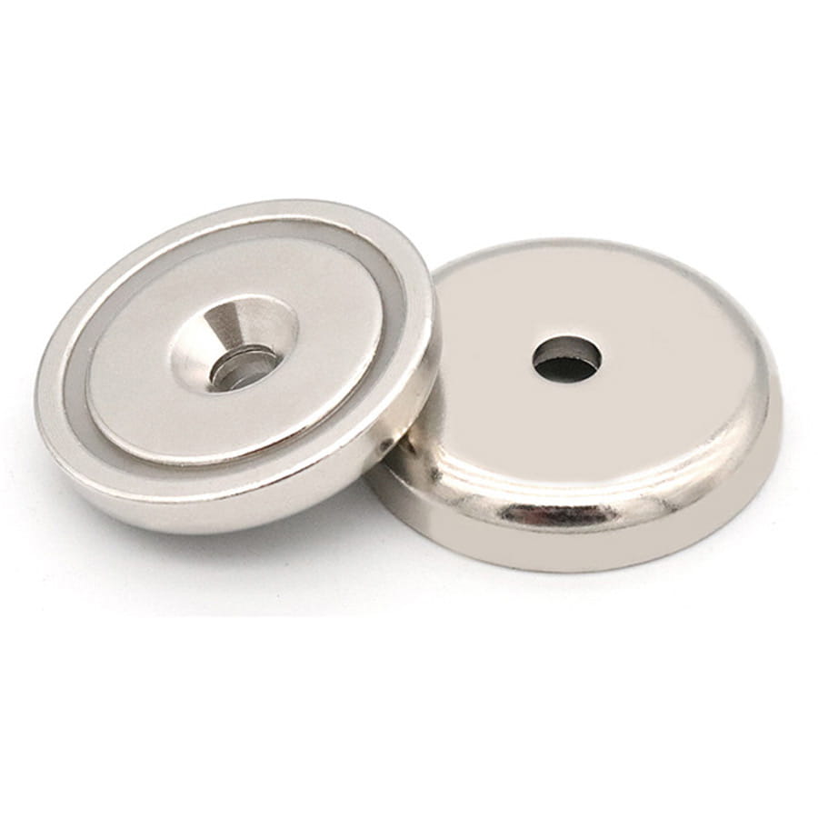 Magnes umieszczono w płaskiej stalowej obudowie, która dodatkowo zwiększa jego stabilność i chroni przed uszkodzeniami mechanicznymi. Dzięki ocynkowaniu stalowa miseczka skutecznie chroni magnes przed kontaktem z metalowymi elementami znacząco wydłużając jego żywotność.