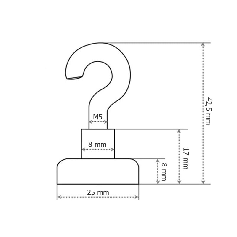 Uchwyt magnetyczny neodymowy z haczykiem sufitowym. Obudowa uchwytu niklowa. Uchwyt posiada gwint M5.